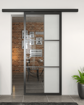 Introduce bold elegance to your home or workspace with the Industrial Chic 3 Panel Crittall Style Pelmet Sliding Door. Drawing inspiration from iconic 20th-century industrial design, this system pairs robust carbon steel frames with premium glass panels to create a streamlined, light-enhancing feature that suits both modern and classic interiors.