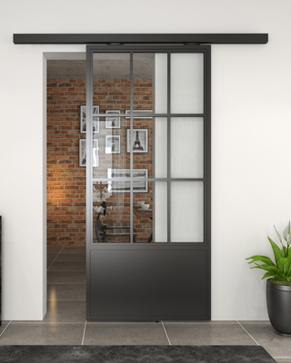 The 6-9 panel configuration with a kick plate amplifies the classic Crittall aesthetic, creating a bold, structured layout with strong industrial character. The added kick plate introduces a functional, workshop-inspired detail while reinforcing the robust look of the design. Slim carbon steel frames paired with glass deliver a refined yet durable appearance that complements industrial, loft-style, and contemporary interiors.