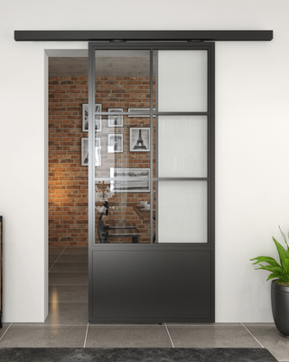 This package combines a multi-panel steel and glass door with kick plate, including pelmet sliding hardware system, delivering a clean, refined finish while maintaining authentic industrial character. The addition of a kick plate enhances durability, making it ideal for high-traffic residential and commercial spaces delivering both architectural presence and everyday functionality.