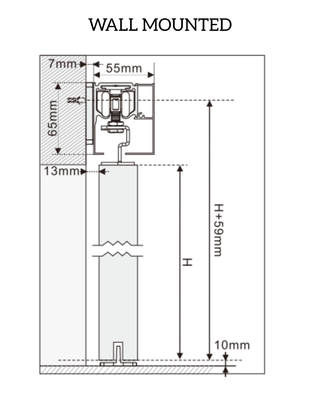 This system features a wall-mounted track concealed behind a streamlined pelmet, maintaining a clean architectural finish while allowing the door to glide smoothly across the wall surface.