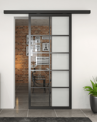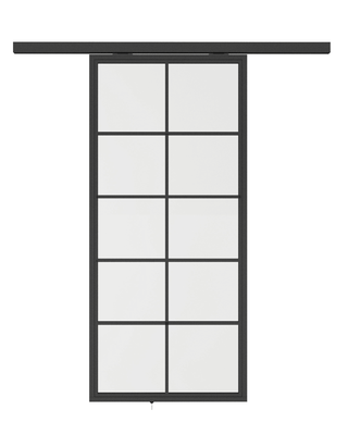 The 10–15 panel configuration creates a structured, harmonious layout, maximizing glass surfaces while maintaining the timeless rhythm and symmetry characteristic of traditional Crittall design. Gliding smoothly on a top-mounted track concealed within a sleek wall-mounted pelmet, this door combines architectural presence with everyday functionality.